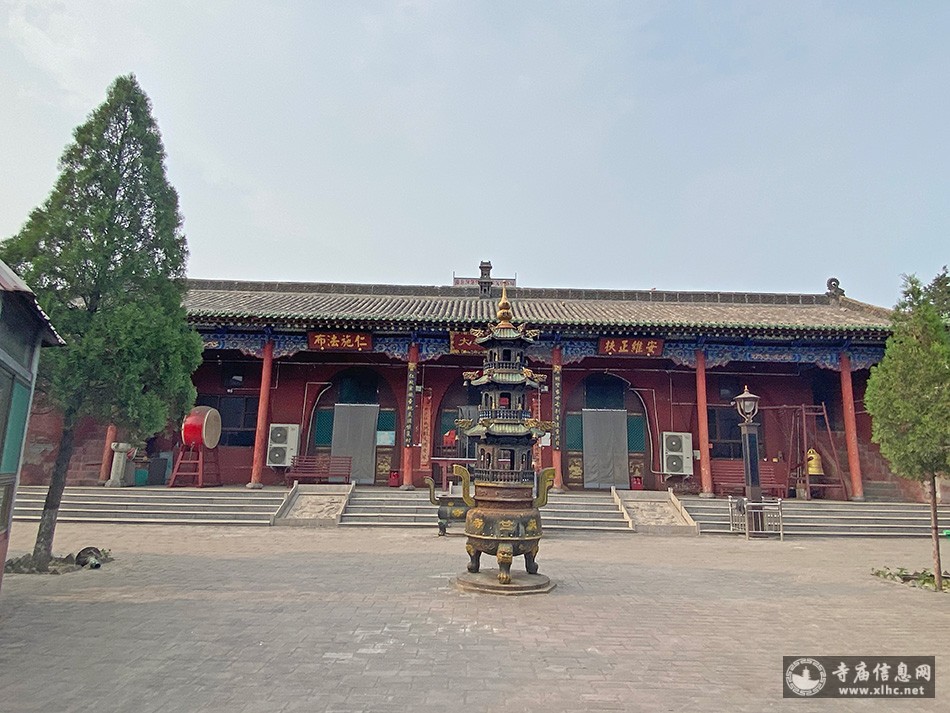 过殿向北的中轴线两侧为配殿,东西各七间(窑洞式),两排窑洞南端与过殿的三眼窑洞连接,北端原来也有小门与正殿通连,四周青砖券拱的窑洞相互通联,组成该寺后院。西配殿上三间供僧人、居士居住,现在有僧人约10余位。下三间供奉地藏菩萨,最南一间是厨房。东配殿上三间供寺庙负责人接待香客,最南两间供香客用斋。后院上方放置有香炉和一座小型宝塔,炉内插满香客的供香,青烟缭绕,可见香客之多。后院下方供奉着一座金身大肚弥勒佛像,与过殿的门洞迎面相对,他右手握布带,左手持念珠,笑容满面,和蔼可亲,大肚能容容天下难容之事,笑口常开笑世间可笑之人,形象很是生动有趣。当人们进入佛寺中看到这一乐呵呵的形象,对佛门的亲切之感也会油然而生。