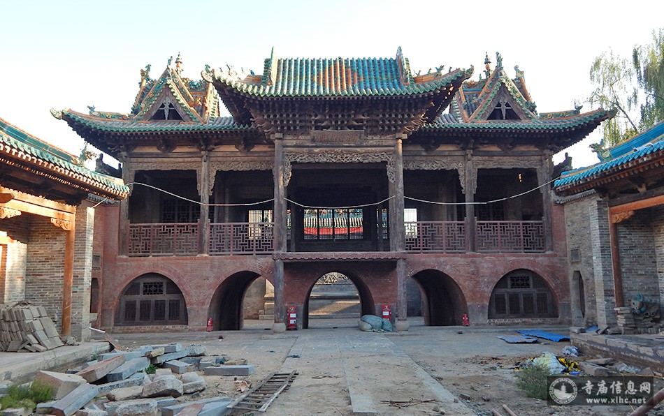 山门戏楼名为“海蜃楼”,分上下两层。下层为山门,上层为戏楼,整体前出抱厦。戏楼整体为单檐歇山顶,黄蓝琉璃瓦,抱厦为单檐卷棚歇山顶,两边乐池部分为十字歇山顶。在抱厦中心部位用黄琉璃做成方胜图案。屋顶有龙珠、宝阁、鸱尾、仙人、瑞兽、垂兽、戗兽、套兽等。山门为青砖建造,有5个拱形门洞,门洞高2.66米。山门两侧为八字影壁,其形制同临街影璧,影壁中部浮雕,东边为福字,西边为寿字,落款陈抟书。抱厦面阔一间,圆木柱,石鼓础,木柱贯通上下两层,柱头承接大小额枋、平板枋。雀替部位雕刻为二龙戏珠。平板枋上安放斗拱。